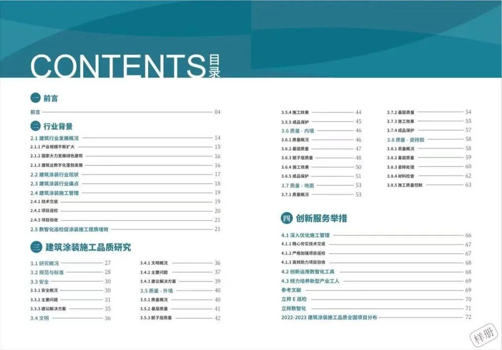 此次《报告》深入解读了房地产行业高质量、高品质的发展趋势,输出前瞻性洞察。此外,依托“立邦E涂佳”全流程数智化优质交付协同平台,《报告》汇集了建筑涂装工程项目的数智化巡检实践成果,针对全国34个省、直辖市、自治区共3717个涂装项目,出具共4561份项目巡检质量报告。通过安全、文明、质量三个标准维度,《报告》严格依照国家、行业的规范与标准,剖析项目交付中的问题并提出解决方案,切实为推动行业交付品质提升给出解题思路。